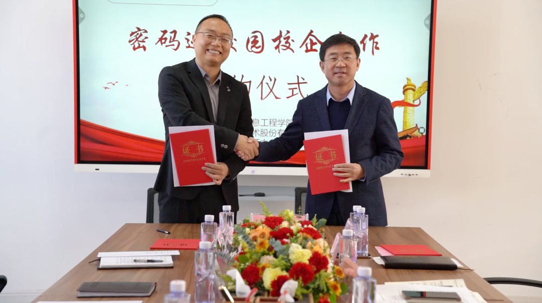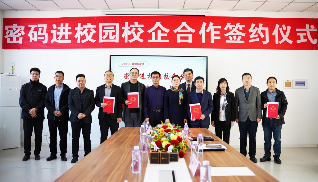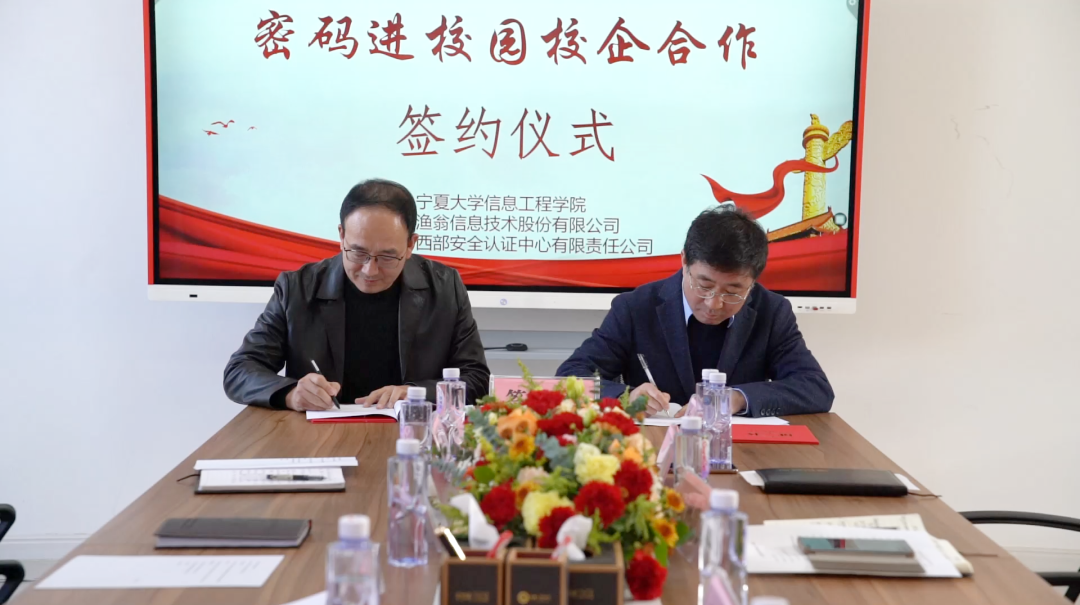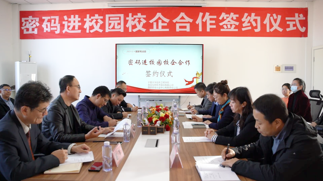 在第八个国家宪法日来临之际,为深入贯彻落实《中华人民共和国密码法》,进一步加快密码专业人才队伍建设步伐,打通我区密码产学研创新链、价值链,12月1日,“密码进校园校企合作签约仪式”在宁夏大学信息工程学院成功举行。此次签约仪式由宁夏密码管理局指导,宁夏商用密码协会会员单位美高梅美高信息技术股份有限公司、西部安全认证中心有限责任公司同宁夏大学信息工程学院签署战略合作协议,共同为我区密码学科建设、密码实训基地建设、密码人才培养贡献力量。宁夏密码管理局副局长李大苞,商密处副处长丁杰,宁夏大学信息工程学院党委书记武林波、院长冯锋、副书记孙莉、副院长杨军、学科主任李贯峰,美高梅美高信息技术股份有限公司董事长郭刚,西部安全认证中心有限责任公司常务副总经理耿方,区内其他商密企业代表等出席了签约仪式,签约仪式由宁夏商用密码协会秘书长赵军主持。