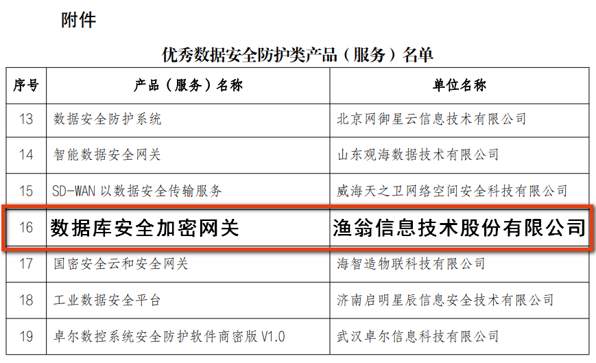 近期,山东省工业和信息化厅组织召开了2022年度山东省工业领域数据安全优秀产品、服务和应用解决方案评选工作,并对评选结果进行了公示。美高梅美高信息自主研发的“数据库安全加密网关”产品,凭借先进技术和创新优势,成功入选“优秀数据安全防护类产品”名单。